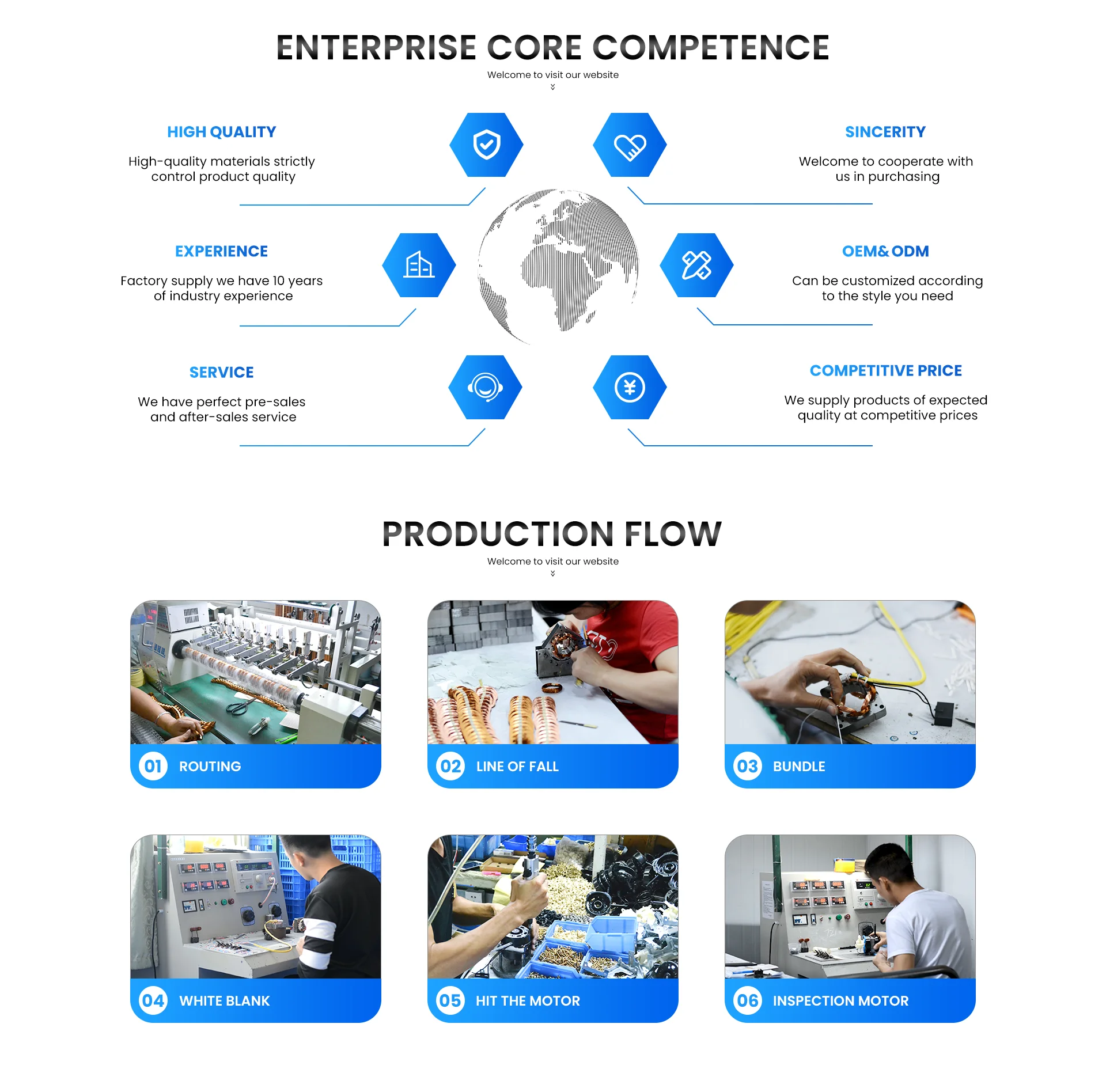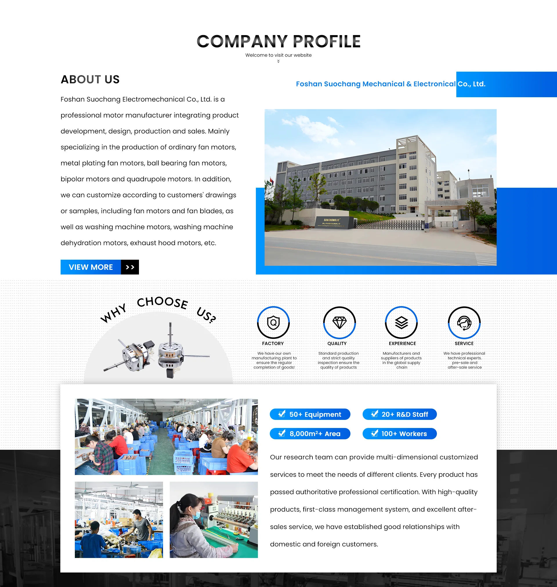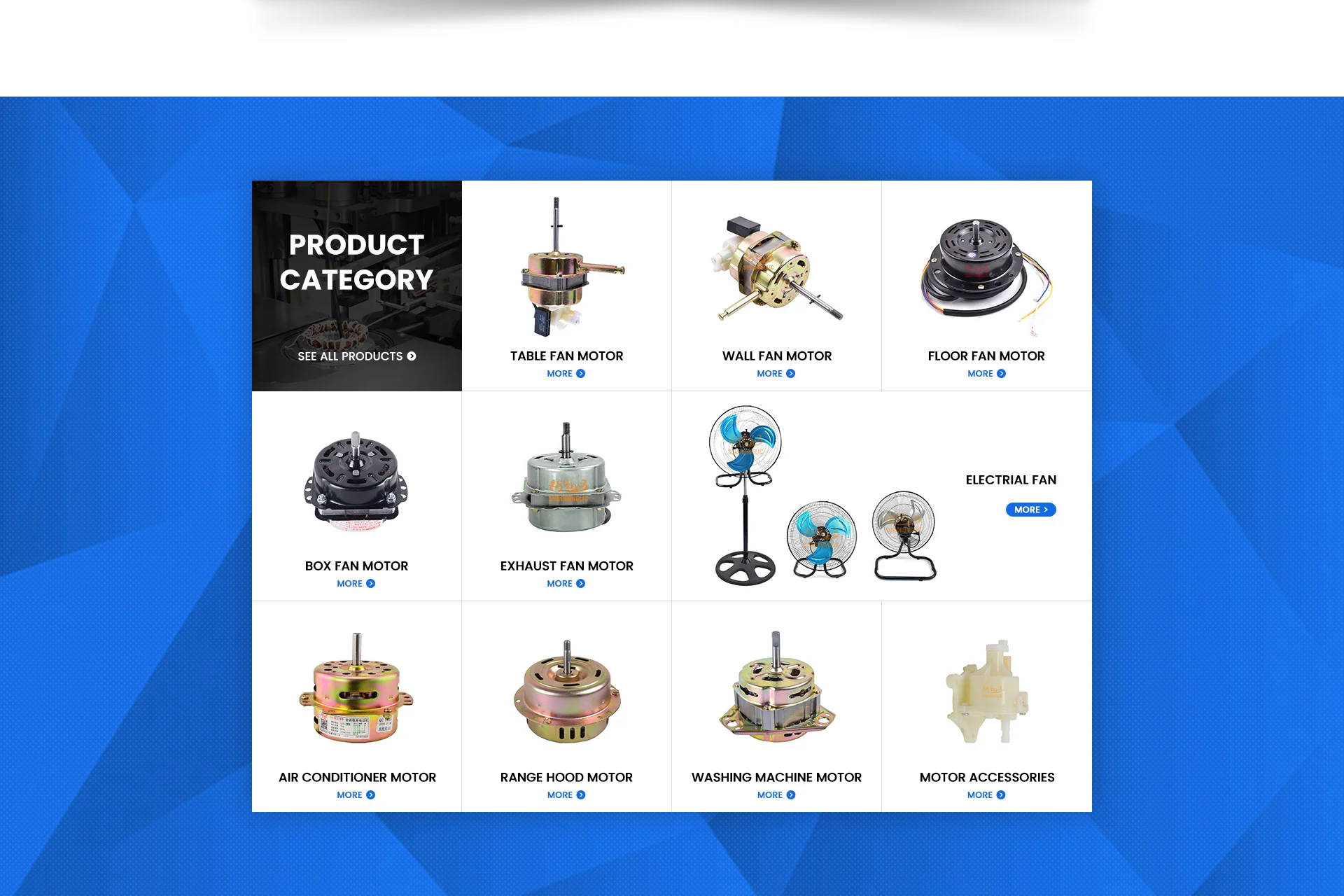Sản Phẩm chính: Động cơ quạt đứng, động cơ quạt bàn, động cơ quạt thông gió, động cơ mui xe phạm vi, Quạt